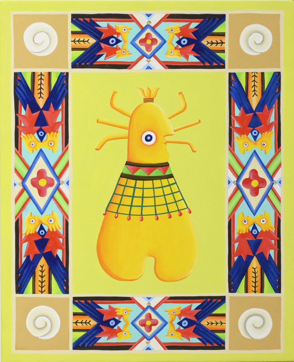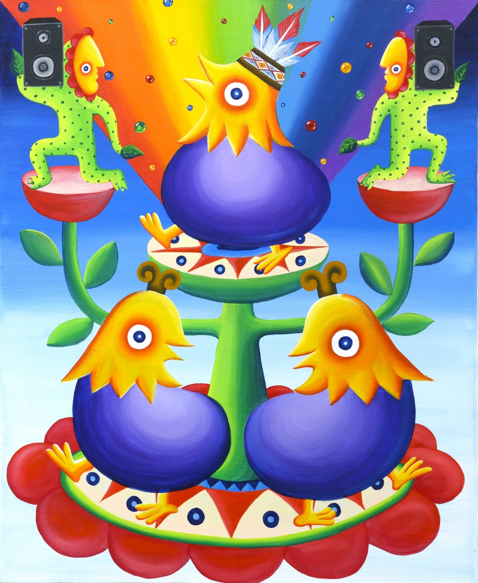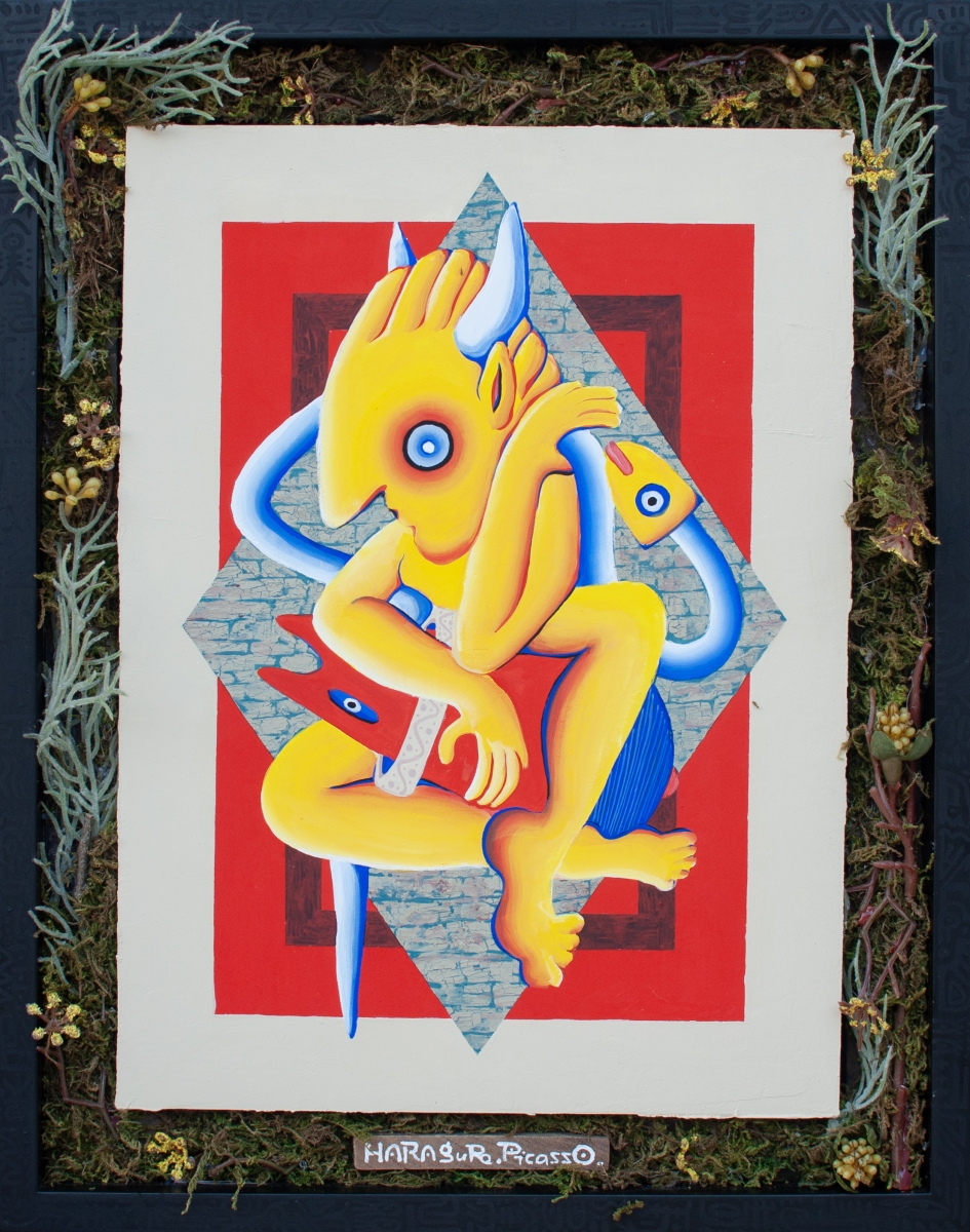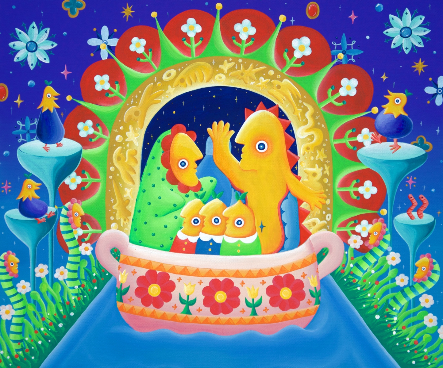 〈はらぐろ〉もともと岡本太郎の影響で土偶や土器に興味を持ち、大学の頃からピカソや岡本太郎のような原色の強い色彩と、土偶のような偶像的なシルエットが組み合わさった「人」の絵を描くようになっていきました。その後、信也さんと一緒に生活するようになり、信也さんは本当に生き物が好きで、近所の道をちょっと一緒に歩いただけでも、すぐに鳥や虫を見つける姿が自分にとってとても新鮮なことで。そこから目で見えなくても、愉快な精霊みたいな存在がそこいらじゅうにいるような感覚がわたしの中にも湧いてくるようになり、昔から描いていた偶像的なシルエットの絵が、人と限定するよりも動物や虫や植物などをヒントにもっと自由な姿で存在する世界を描く、いまの作風へ変化していった感じです。