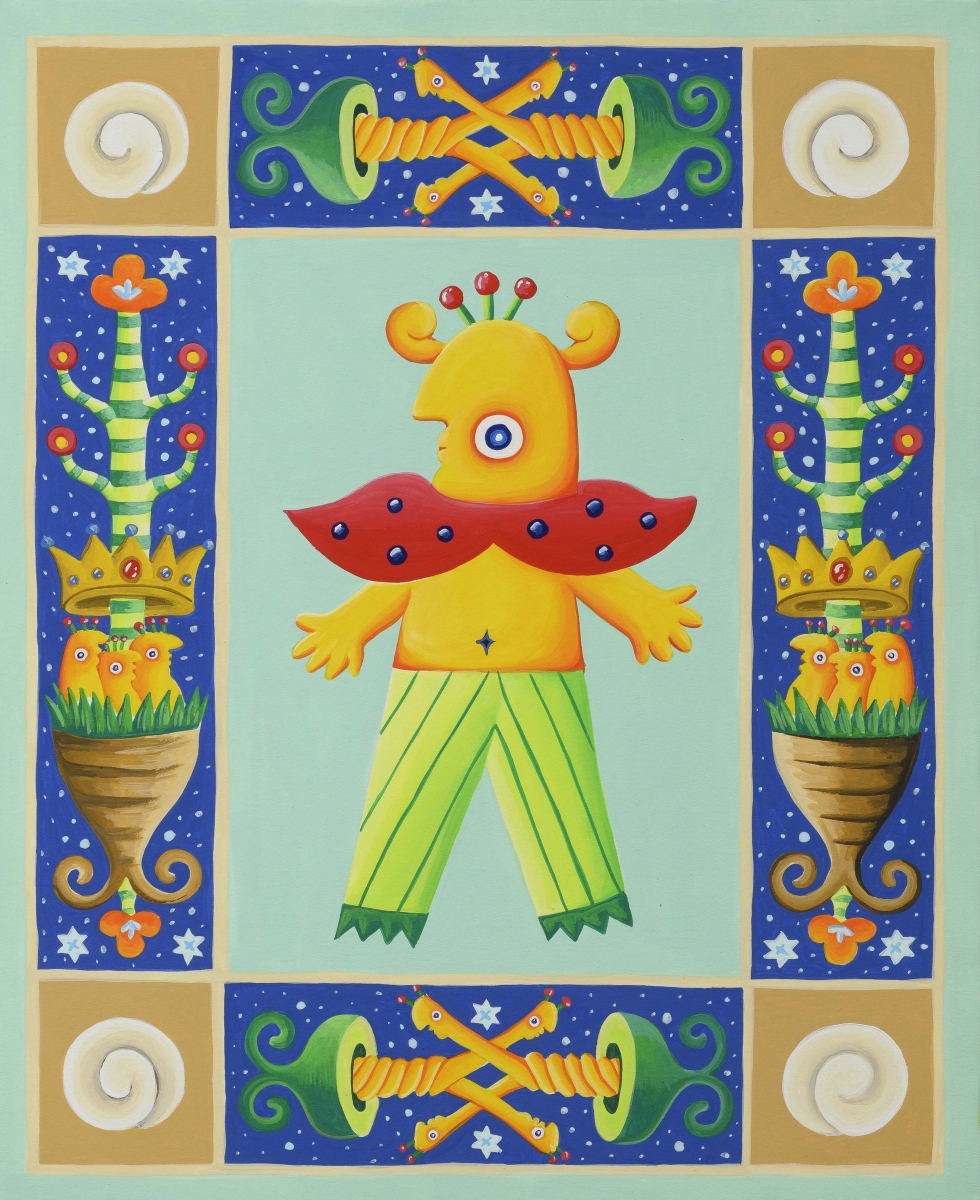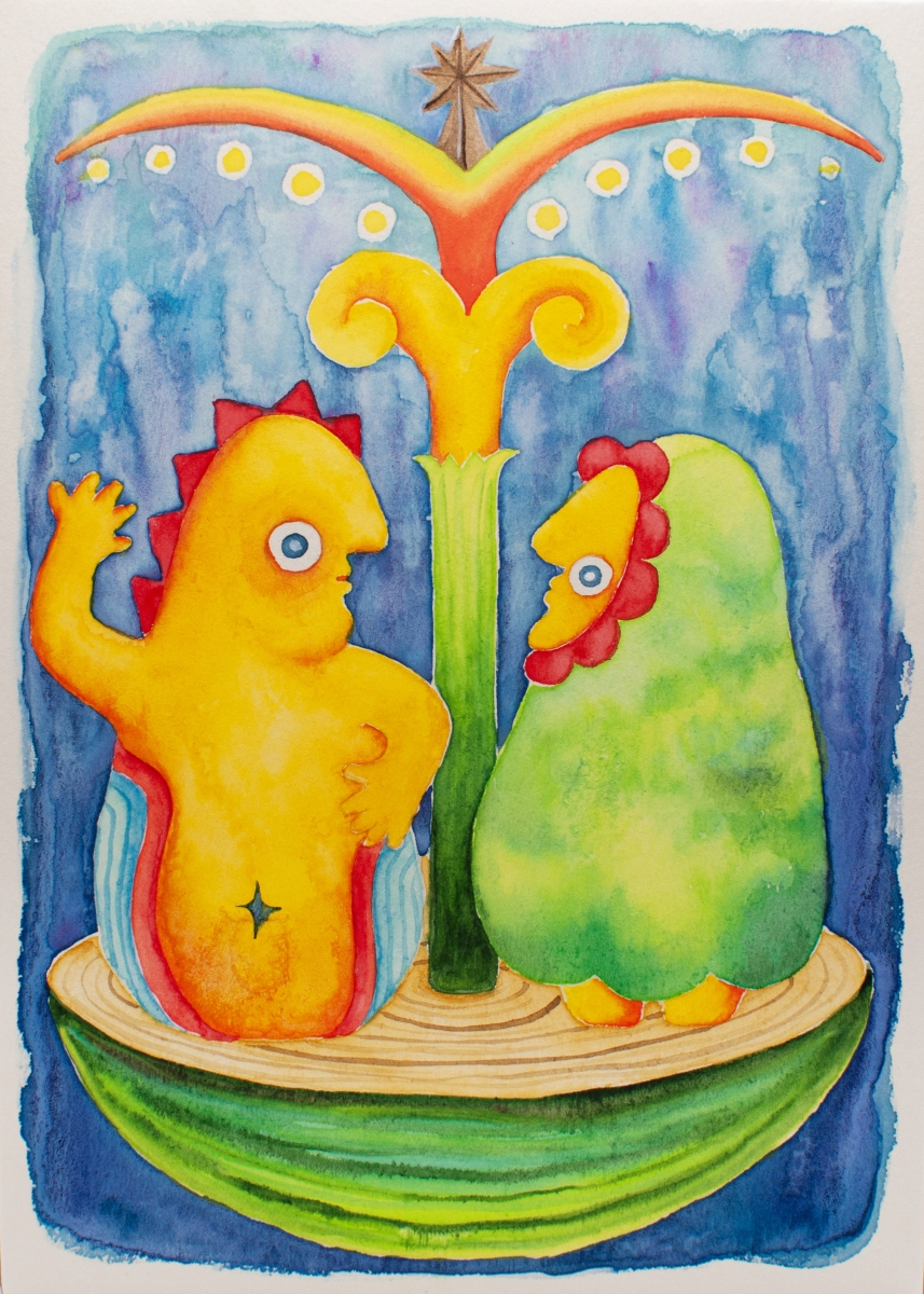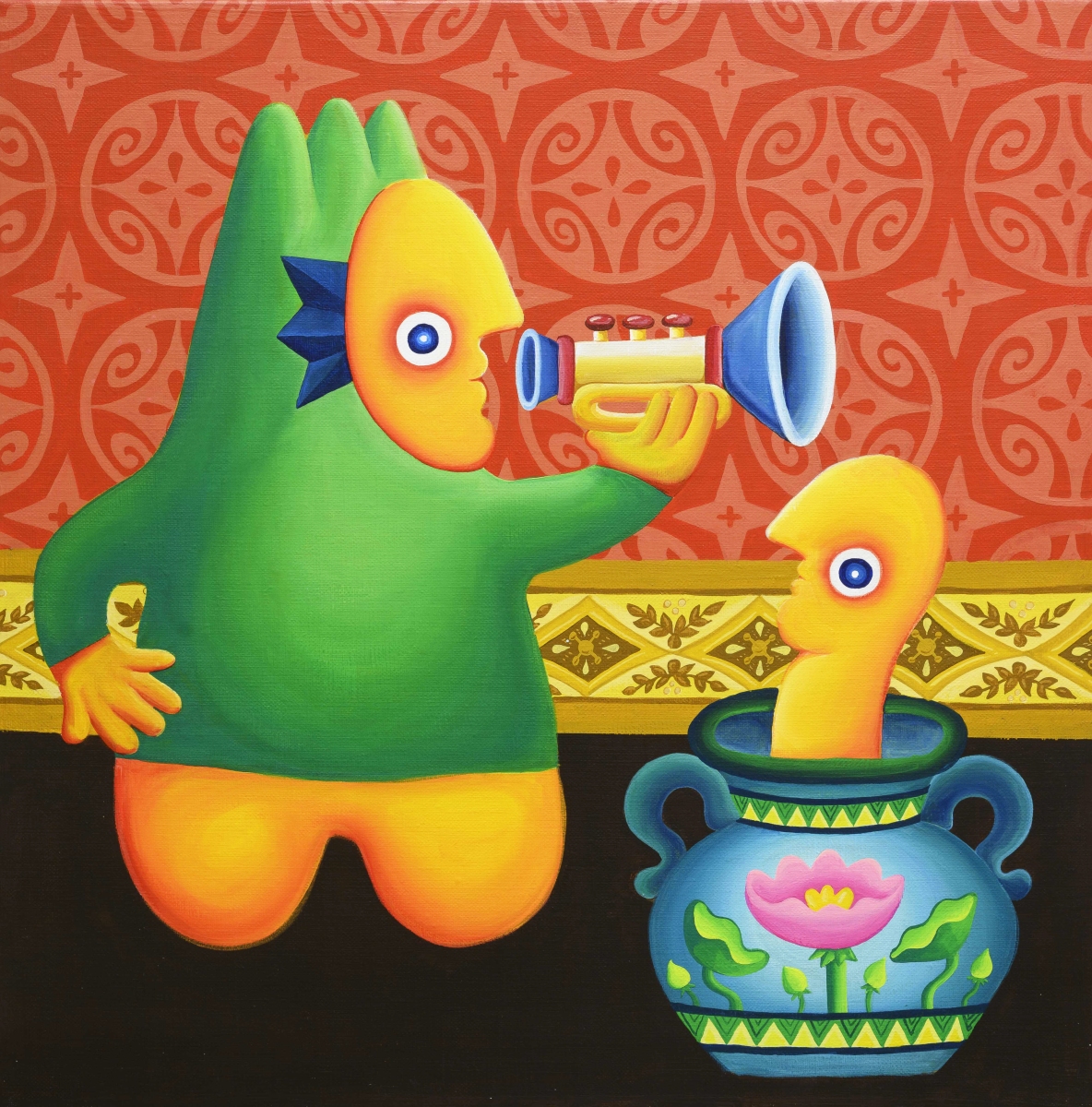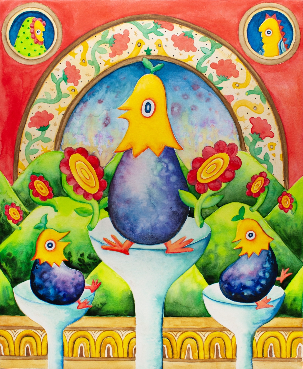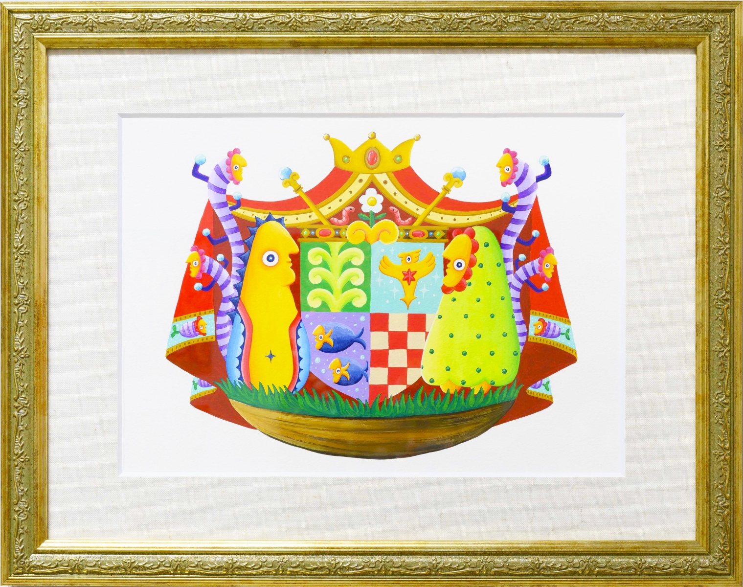 〈はらぐろ〉もともと岡本太郎の影響で土偶や土器に興味を持ち、大学の頃からピカソや岡本太郎のような原色の強い色彩と、土偶のような偶像的なシルエットが組み合わさった「人」の絵を描くようになっていきました。その後、信也さんと一緒に生活するようになり、信也さんは本当に生き物が好きで、近所の道をちょっと一緒に歩いただけでも、すぐに鳥や虫を見つける姿が自分にとってとても新鮮なことで。そこから目で見えなくても、愉快な精霊みたいな存在がそこいらじゅうにいるような感覚がわたしの中にも湧いてくるようになり、昔から描いていた偶像的なシルエットの絵が、人と限定するよりも動物や虫や植物などをヒントにもっと自由な姿で存在する世界を描く、いまの作風へ変化していった感じです。