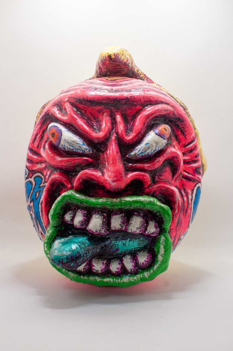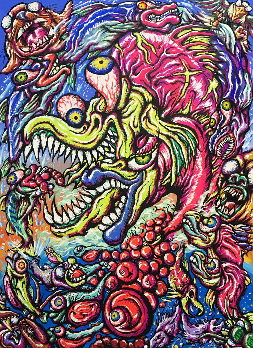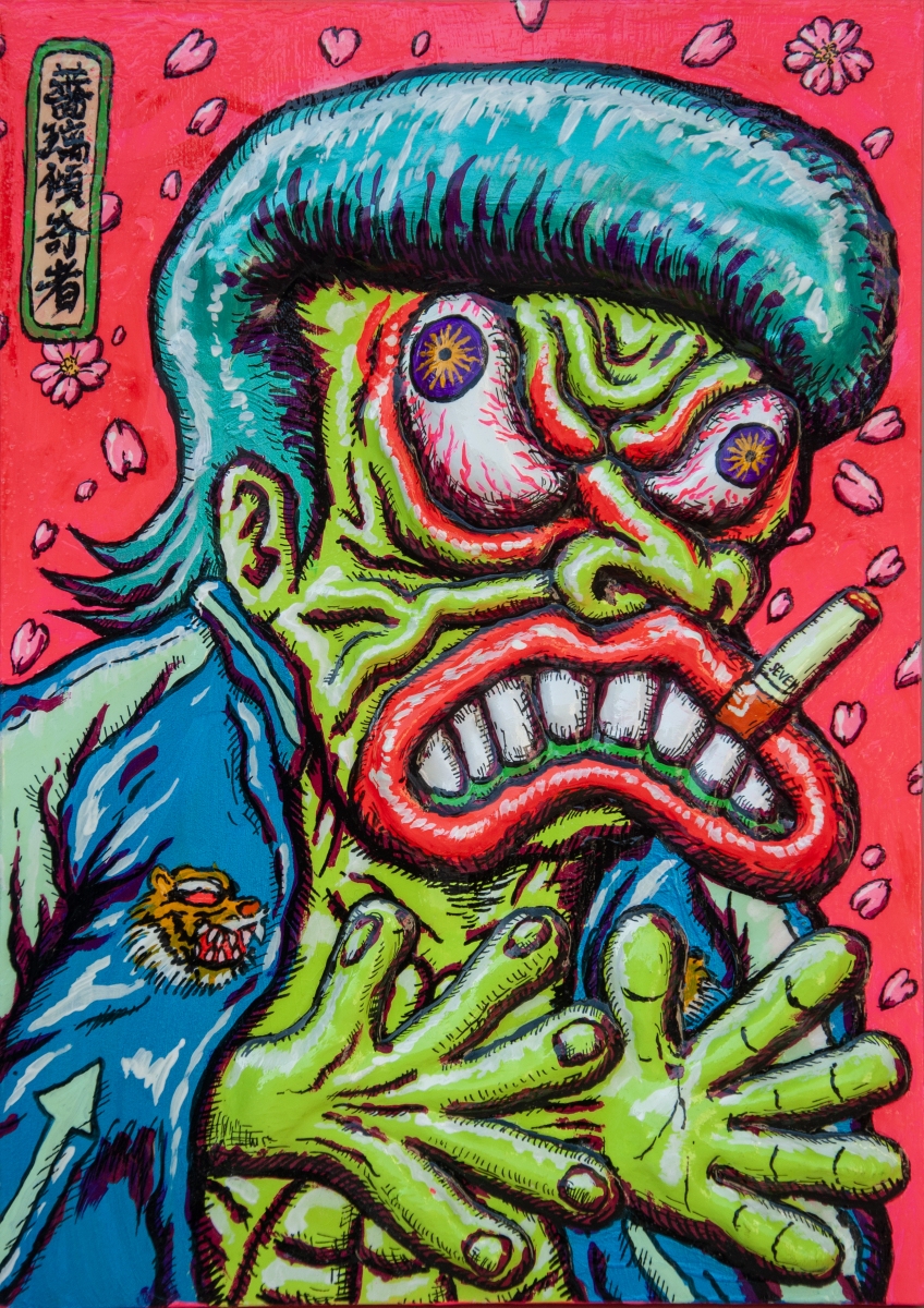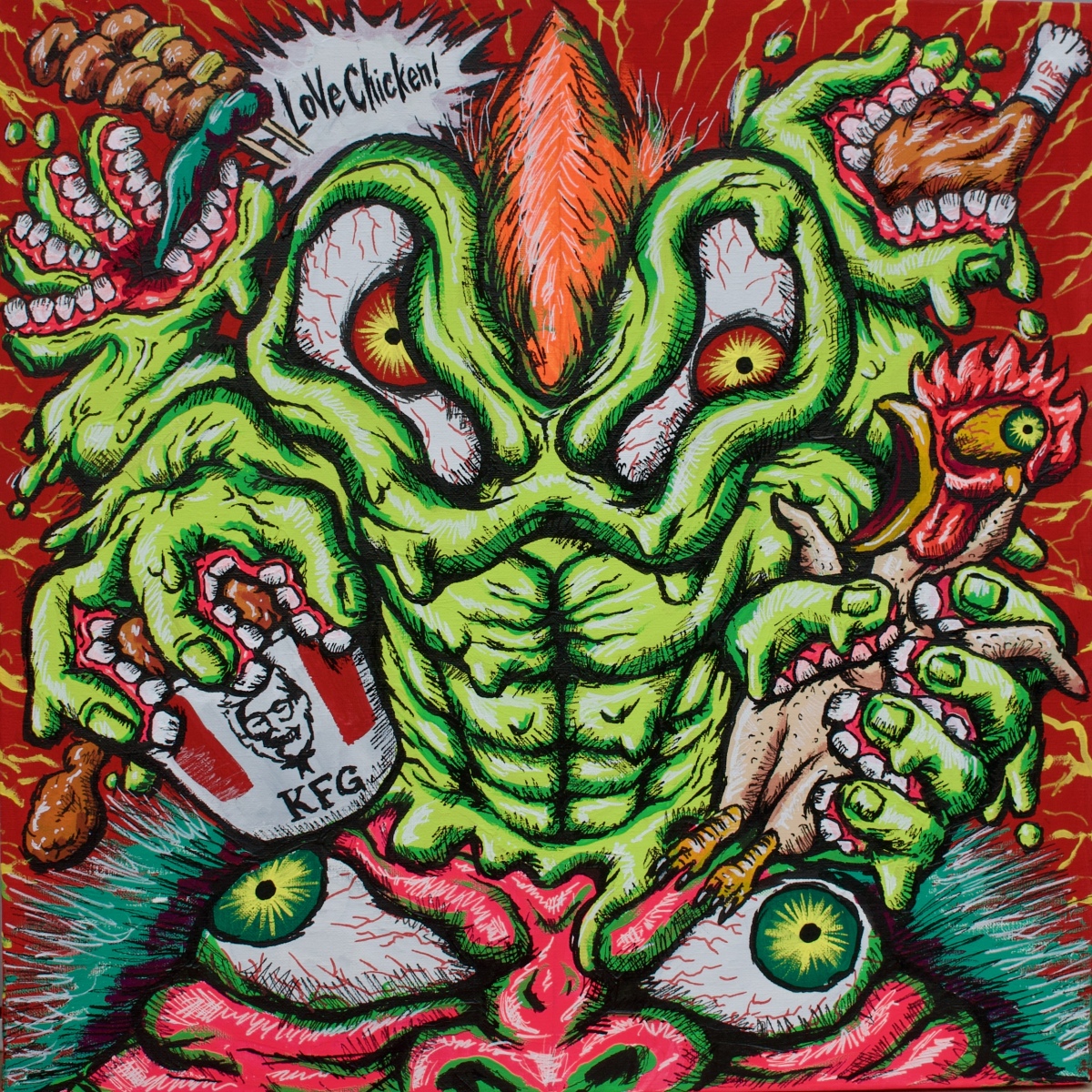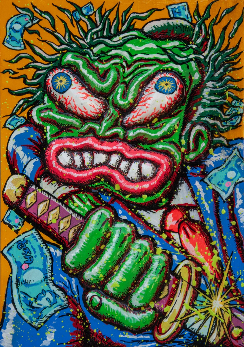日常の中から生まれる感情、沸き起こる激情、社会風刺などを作品内に叩き込む。アクリルガッシュとペンを炸裂させ、カラフルでインパクトのある作品は平面にとどまらず、キャンバスをはみ出て立体作品にも及ぶ。2012年から展示・ライブペイントなどをしながら活動中。