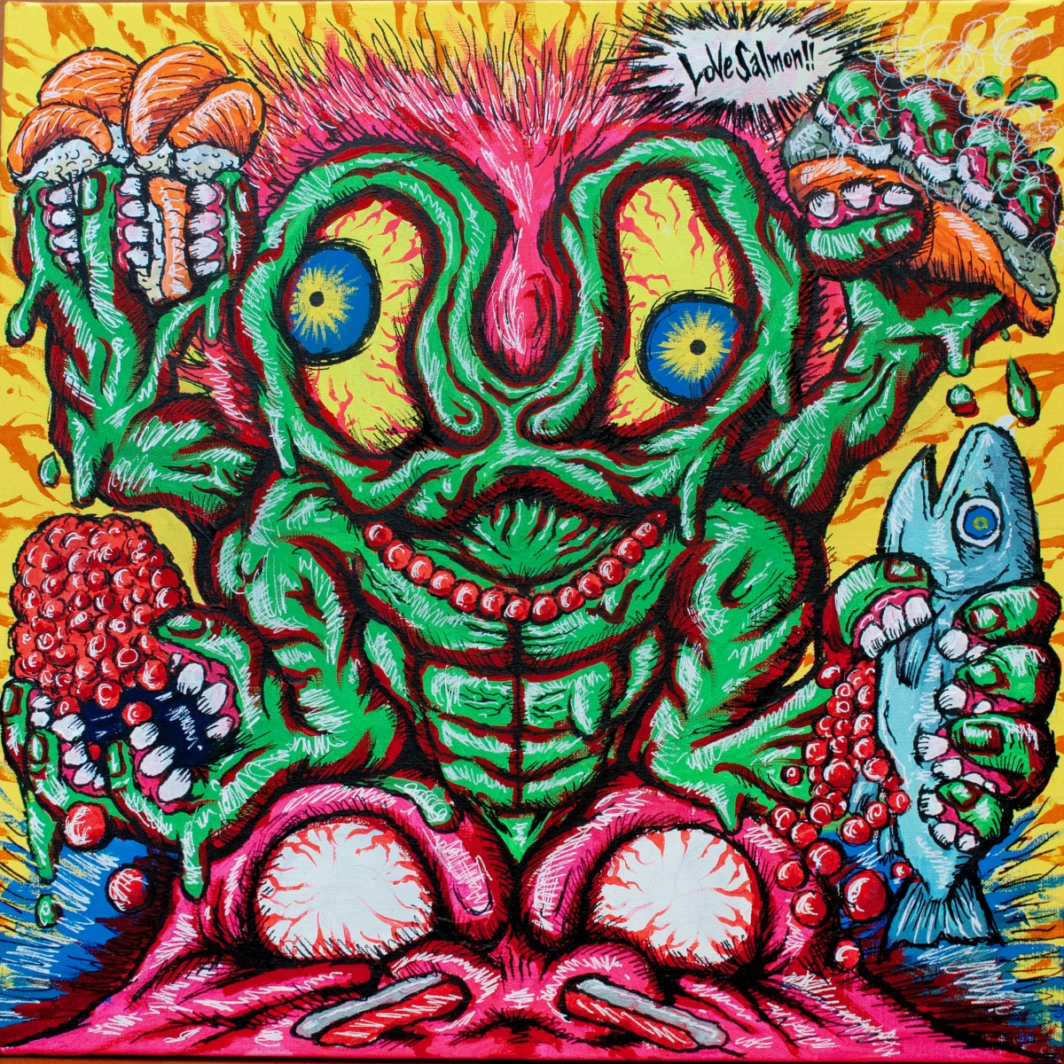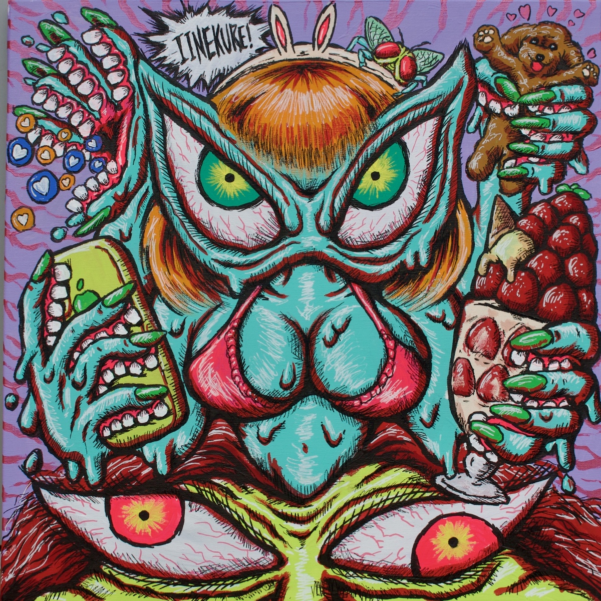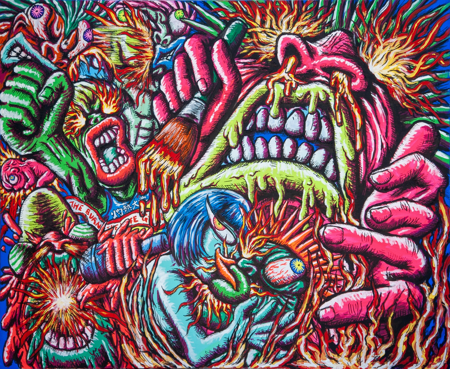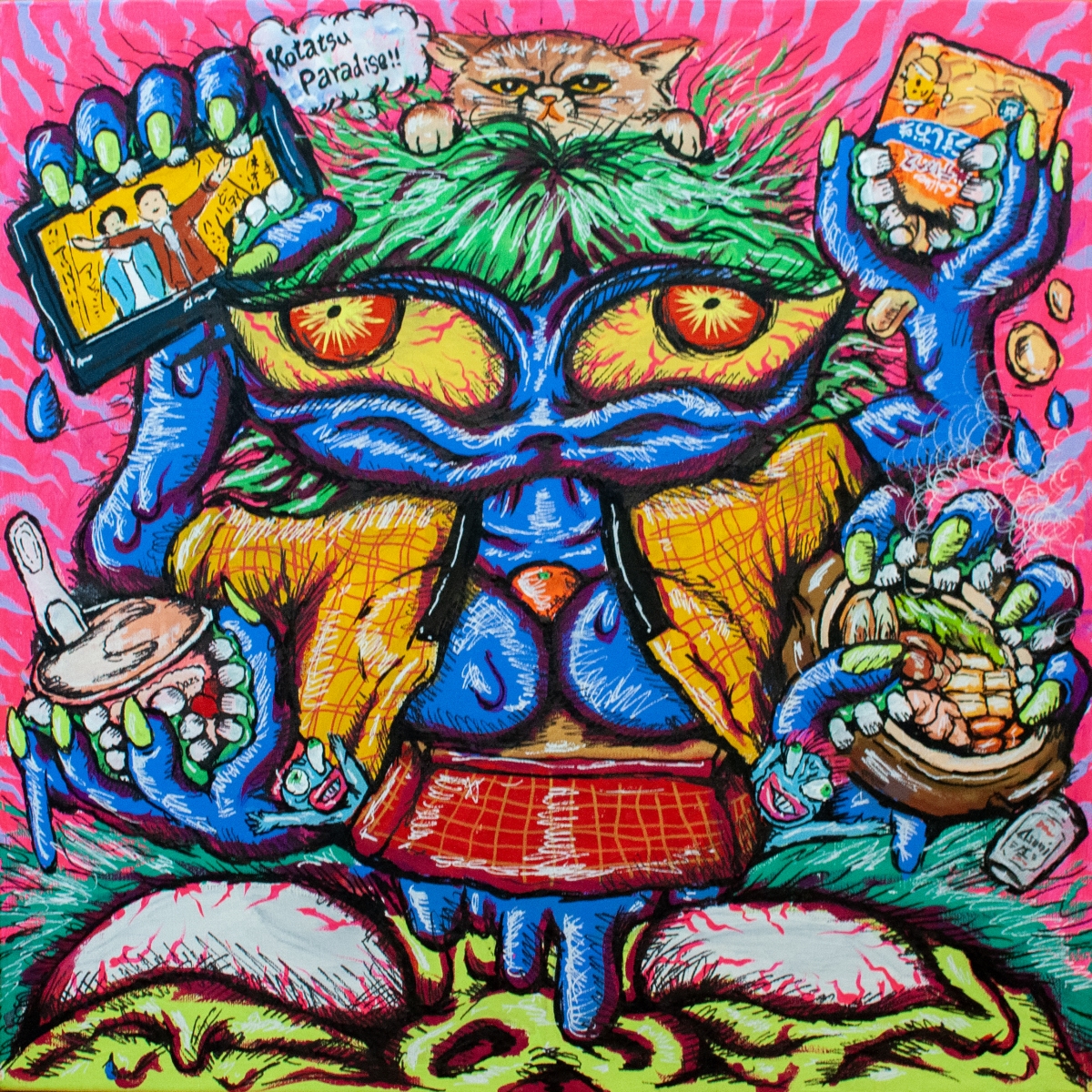日常の中から生まれる感情、沸き起こる激情、社会風刺などを作品内に叩き込む。アクリルガッシュとペンを炸裂させ、カラフルでインパクトのある作品は平面にとどまらず、キャンバスをはみ出て立体作品にも及ぶ。2012年から展示・ライブペイントなどをしながら活動中。