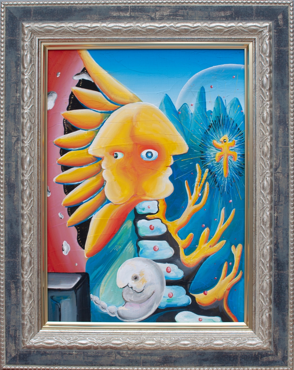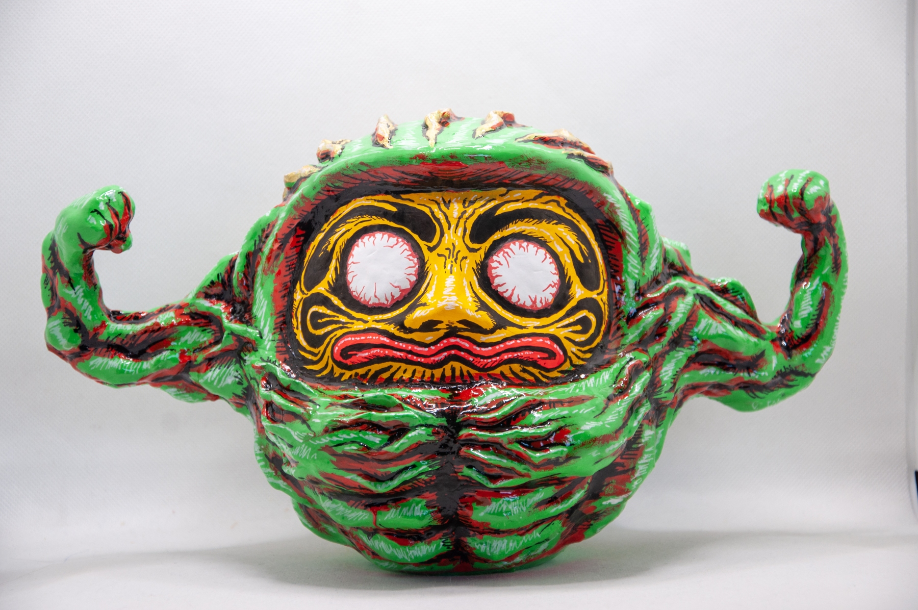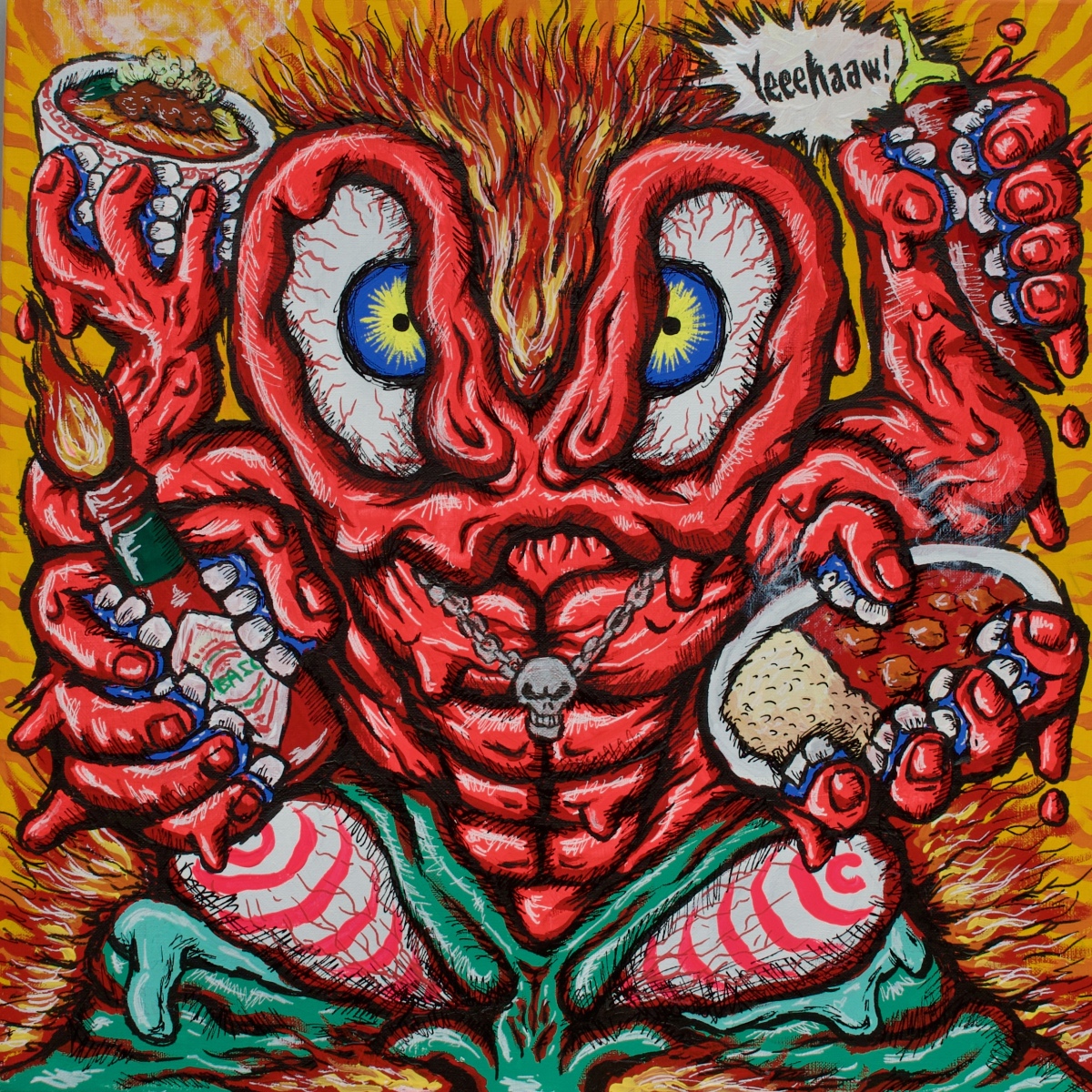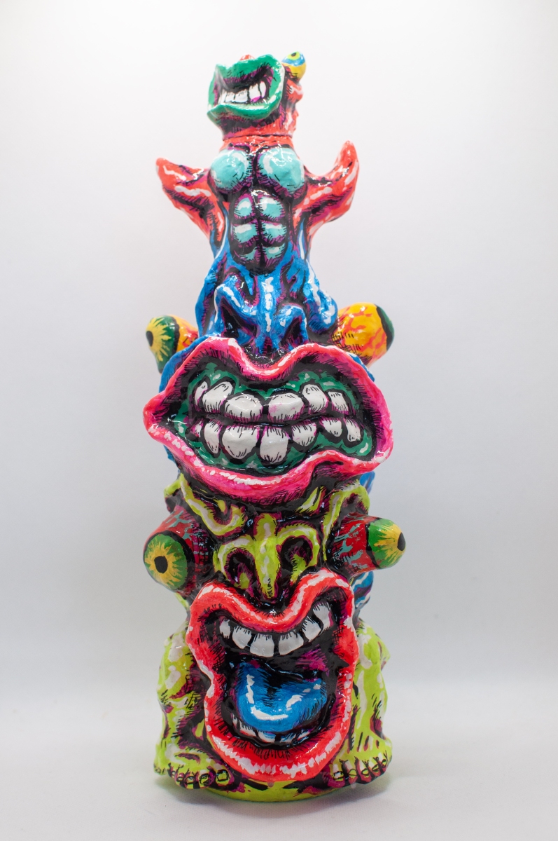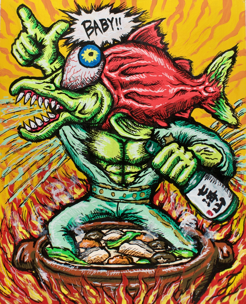 日常の中から生まれる感情、沸き起こる激情、社会風刺などを作品内に叩き込む。アクリルガッシュとペンを炸裂させ、カラフルでインパクトのある作品は平面にとどまらず、キャンバスをはみ出て立体作品にも及ぶ。2012年から展示・ライブペイントなどをしながら活動中。