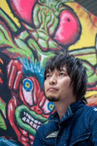 〈はらぐろ〉わたしはこの時すでに色んな場所でライブペイントをする機会に恵まれ始めていて、逆にあのときの自分は少し慢心していたと思います。信也さんに初めて会ったとき寡黙な感じの人だなと思っていたら、初めてのライブペイントだというのに、強烈な色彩の絵が次々に溢れていく様に度肝を抜かれて、わたしの絵はまだまだだったんだと襟を正される気持ちになったのをよく覚えています。その時わたしから信也さんに声をかけて、わたしが当時やっていたライブペイントのイベントで一緒に絵を描こうと誘ったことがきっかけで、一緒に活動していくようになりました。